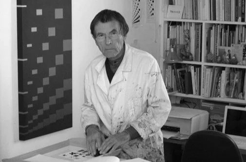 « J’utilise les lignes droites depuis 1974, horizontale, verticale et les 2 diagonales. Dans un premier temps, je voulais opposer mon travail à celui de nos grands ainés : Malevitch et Mondrian, en tentant “d’effacer” la géométrie par un réseau de fines lignes, c’est ce que j’appelle ma période graphique. Au cours des années suivantes, mon travail passa par plusieurs périodes où le trait s’épaissit jusqu’à devenir bande, pour aboutir au signe que j’appelais “Quadrille”. En 1995, j’abandonnais les obliques. Depuis cette date, mon travail est une recherche sur les rythmes, obtenus à partir des chiffres ; rythmes irréguliers avec “Gradations” où les carrés ont leur surface divisée par des traits et rythmes réguliers avec “Cadences” où les rangées de carrés sont soulignées seulement haut et bas. L’année 2003 voit le début de la “Suite Fibonacci”.