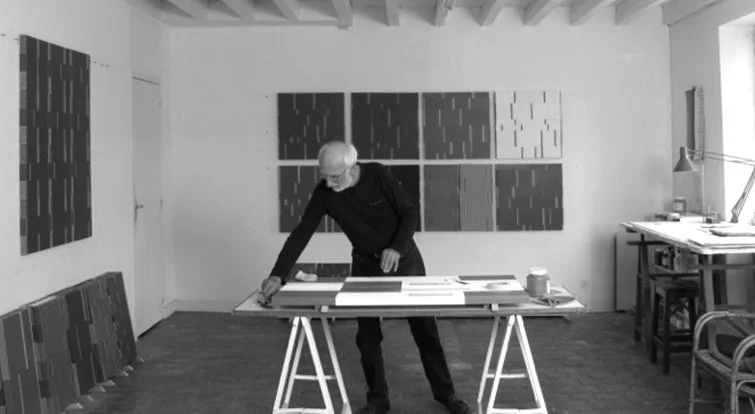 La pensée préside donc à l’exécution, l’œuvre ne saurait être différente de ce qui a été précédemment élaboré, postulat en ce sens fidèle aux principes de l’art concret. Ces différents espaces sont d’abord peints, puis suffisamment recouverts d’une couche de noir, ou de blanc, ou d’une couleur supplémentaire pour que seules restent visibles des traces linéaires marginales, scandant la surface du tableau. Leur présence colorée à intervalles rythmés crée un jeu d’optique où motif et fond tendent à s’inverser. Cet effet d’animation, de va-et-vient, de mouvement, est encore accentué par l’imperceptible présence de la surface occultée, qui modifie la luminosité de la couleur du fond.